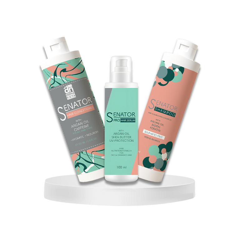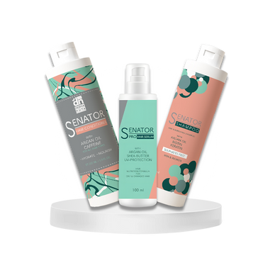The Senator hair care set includes shampoo, conditioner, and serum formulated to repair and protect hair from root to tip. The shampoo cleanses the scalp deeply without dryness and boosts circulation to reduce hair loss. The conditioner moisturizes and prevents breakage, while the serum fights dryness, frizz, and damage, protecting hair from heat and sun exposure. The result is smooth, shiny, and healthy hair full of vitality.
